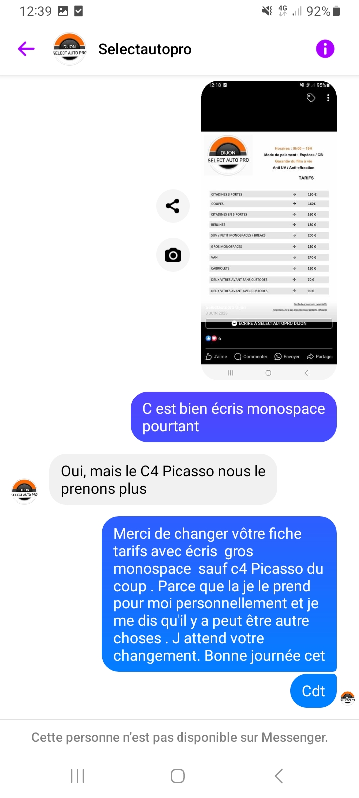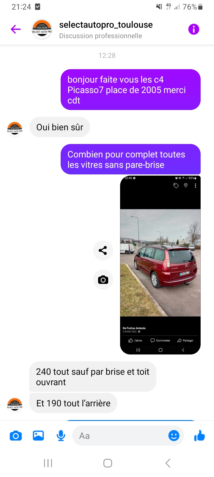 Select auto rien de plus , voilà le nom que devrais porter ce franchise . Je joint des captures d écran d aujourd'hui Au lieux de proposer un prix plus élever garder le véhicule une journée mais non impossible suite à mon blocage un appel téléphonique à été fais , tomber sur une personne relativement correct qui m explique que mon véhicule est trop cassé couille à faire donc il ne préfère pas le faire . Quelle professionnalisme.... 3 autres centres a 220 et 240 euros complet sauf pare brise contacter n ont pas hésiter une seul seconde et eux sont très pro pour le coup .