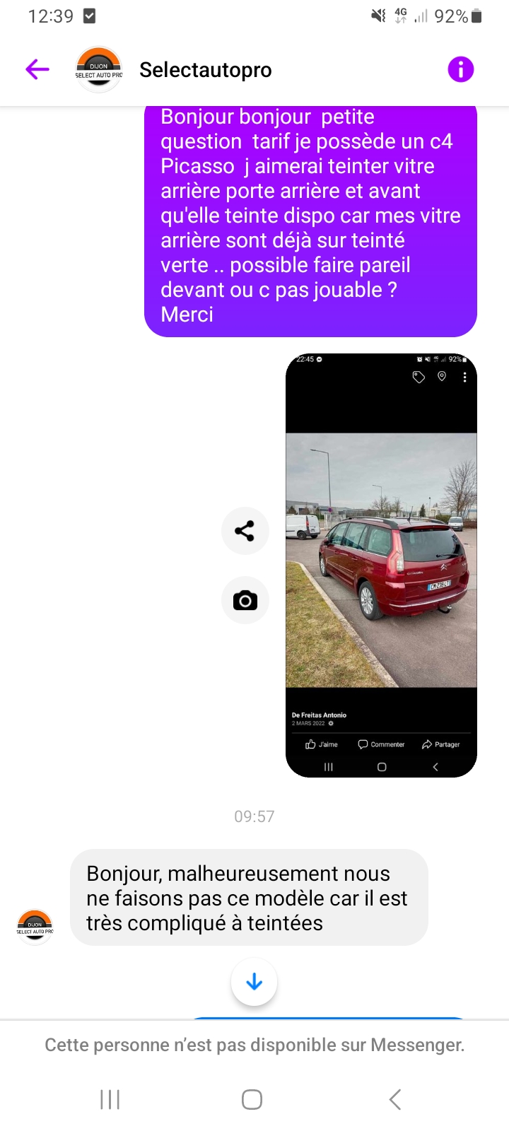 Je sort mon véhicule de selectauto il a 2h ,vraiment du beau travail et plus rapide que prévu, franchement des pros je recommande sans hésitation, bravo à l'équipe.